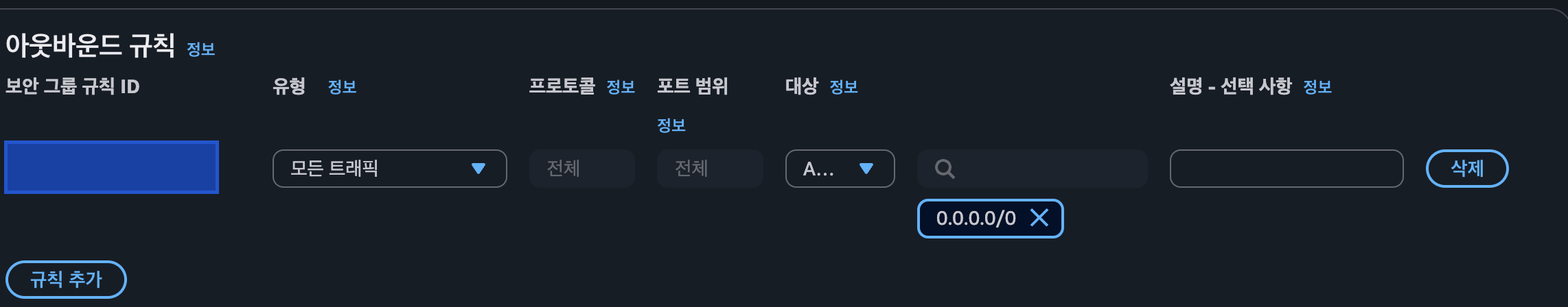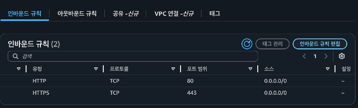 EC2 ๋ณด์๊ทธ๋ฃน ์ค์ ์๋ ์๋์ฒ๋ผ ๋ชจ๋ ํธ๋ํฝ์ ๋ํด ์์๋ฐ์ด๋๊ฐ ๊ฐ๋ฅํ ๊ท์น์ด ์์๋ค.