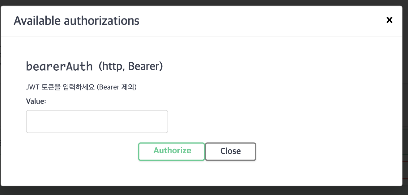 Swagger UI์์ Authorize ๐ ๋ฒํผ์ ํด๋ฆญํ์ฌ AccessToken ๊ฐ์ ์ ๋ ฅํ๋ฉด ,
