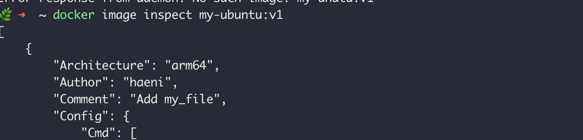 `ubuntu:focal` ์ด๋ฏธ์ง ๊ธฐ๋ฐ์ผ๋ก ๋ง๋ค์ด์ง `my-ubuntu:v1` ์ด๋ฏธ์ง๋ฅผ ๋ณด๋ฉด,