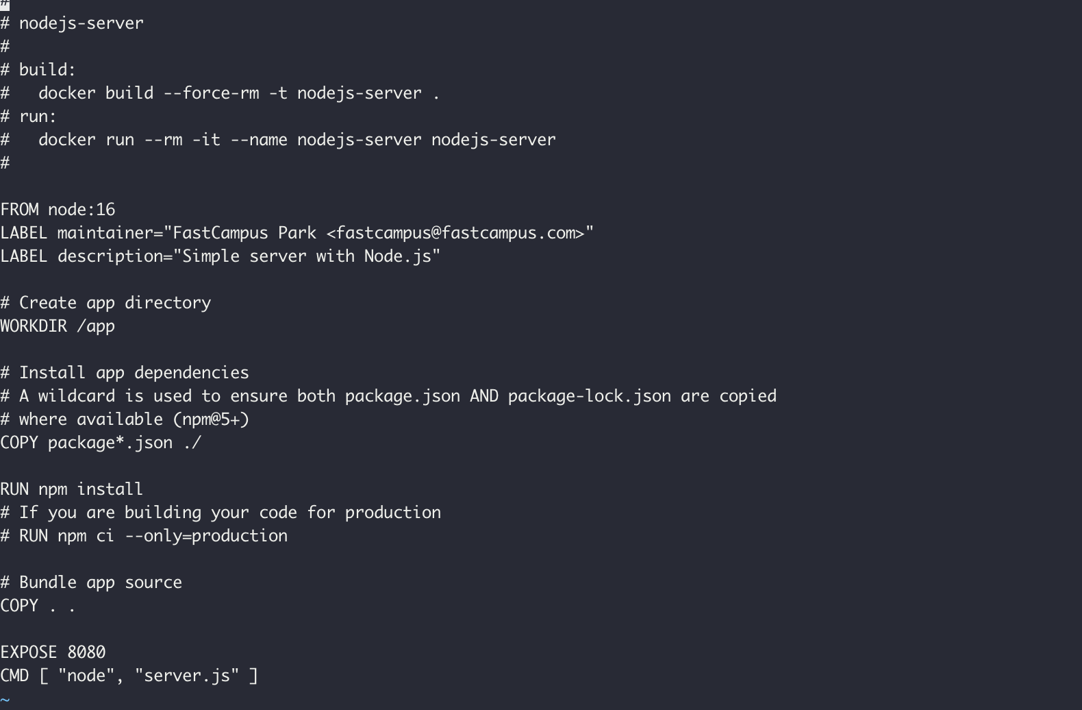 LABEL maintainer="FastCampus Park <fastcampus@fastcampus.com>" #์ด๋ฏธ์ง์ ๋ฉํ ๋ฐ์ดํฐ ์ค์ (์ต์
