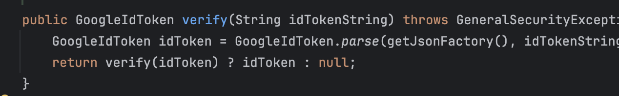 verify() ๋ฉ์๋๋ฅผ ์ดํด๋ณด๋ฉด id_token ๋ฌธ์์ด์ ๋ฐ์ GoogleIdToken ๊ฐ์ฒด๋ก ๋ง๋ค์ด์ ๊ฒ์ฆ์ ์งํํ๋ค.