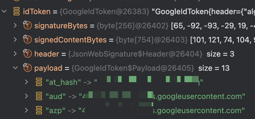 ๊ฒ์ฆ ๊ฐ์ฒด๋ ์ด "aud" ๊ฐ์ด GoogleIdTokenVerifier ์์ฑ ์ ์ค์ ํ๋ ํด๋ผ์ด์ธํธ id๊ฐ๊ณผ ์ผ์นํ๋์ง ๊ฒ์ฆ์ ํ๊ฒ ๋๋๋ฐ,