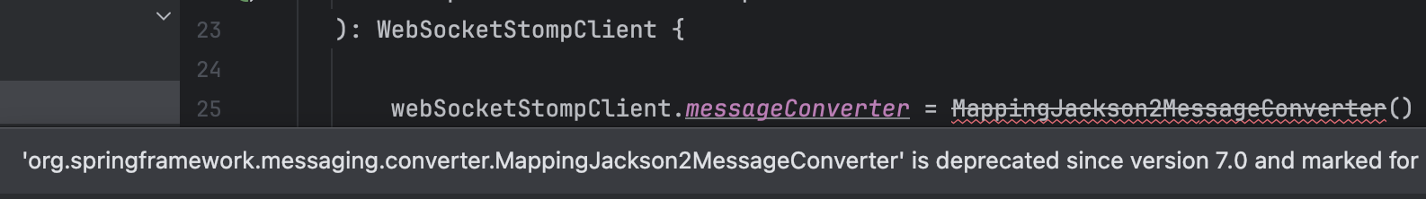 ์น์์ผ ํด๋ผ์ด์ธํธ ๊ฐ์ ์์ ์ฝ๋ ๋ฐ๋ผํ๋ ๋์ค, MappingJackson2MessageConverter๊ฐ deprecated ๋๋ค๋ ๋นจ๊ฐ์ค์ด ๋ด๋ค.